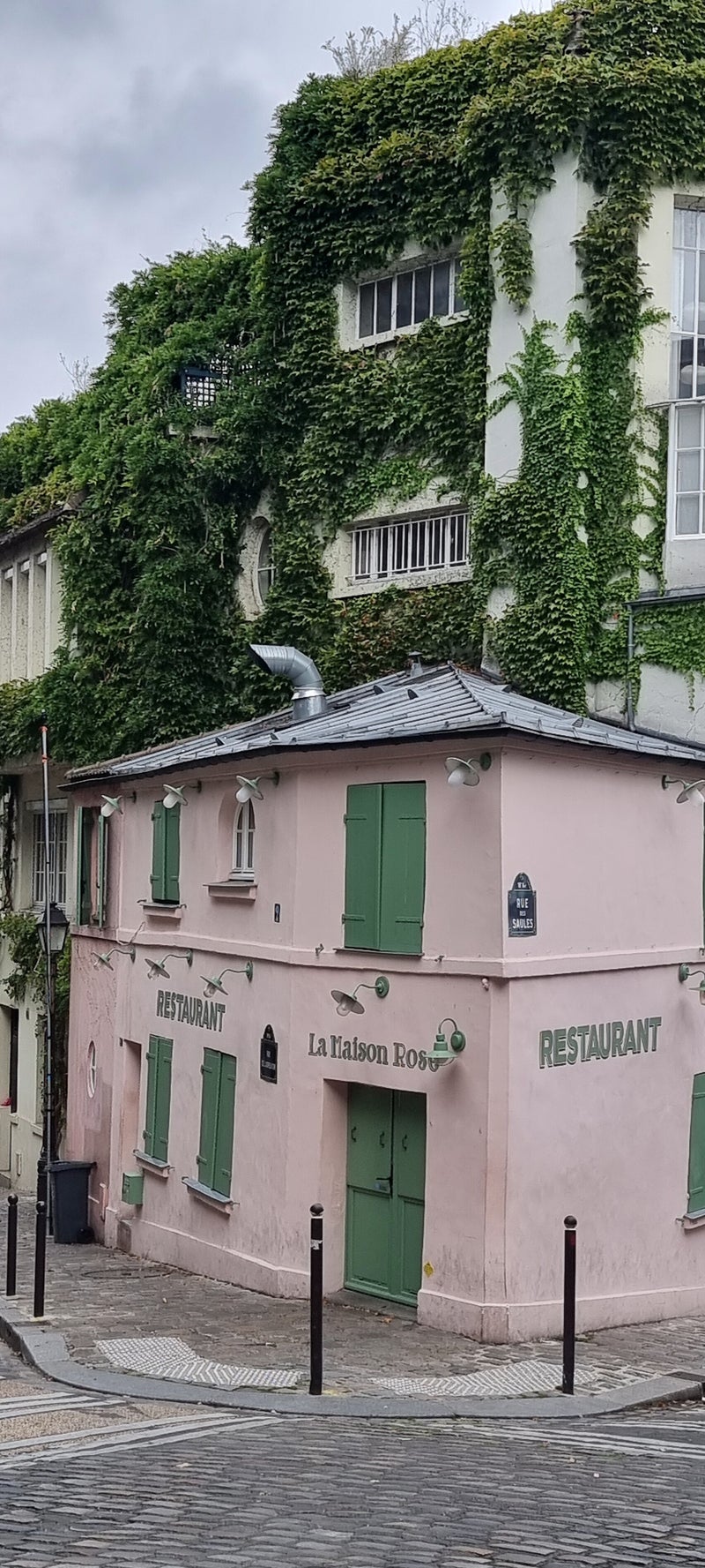 Hét instagrampareltje van de straat is natuurlijk het roze huisje op de hoek: ‘La Maison Rose’, miljoenen keren gefotografeerd en nog steeds zorgt het voor files en opstoppingen. Gebouwd ergens in de 2e helft van de 19e eeuw, een restaurant sinds 1908 en in die tijd een favoriete plek voor kunstenaars om inspiratie op te doen en elkaar te ontmoeten. Bekend van de schilderijen van Maurice Utrillo en van de Amerikaanse serie ‘Emily in Paris’. Jammer genoeg gesloten op maandag maar ik ben al tevreden met een foto van de roze buitenkant van dit iconische gebouwtje.