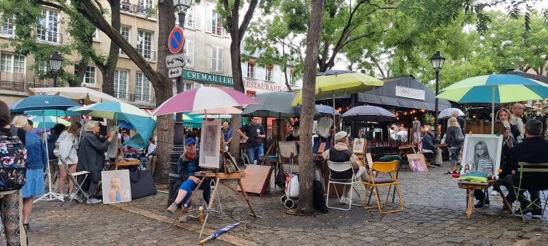 Je belandt vanzelf op de 'Place du Tertre', het pleintje dat decennia lang het epicentrum van de Parijse flamboyante zottigheid was. In de 18e eeuw was dit het oude dorpsplein van Montmartre met het eerste gemeentehuis. Aan het einde van de 19e eeuw diende de 'Place du Tertre' als ontmoetingsplaats en open atelier voor tientallen schilders en tekenaars. Nu lijkt het pleintje eerder op een openluchtmarkt waar snelle ‘kunstwerken’ aan de lopende band worden geproduceerd en voor snelle toeristenkopers.