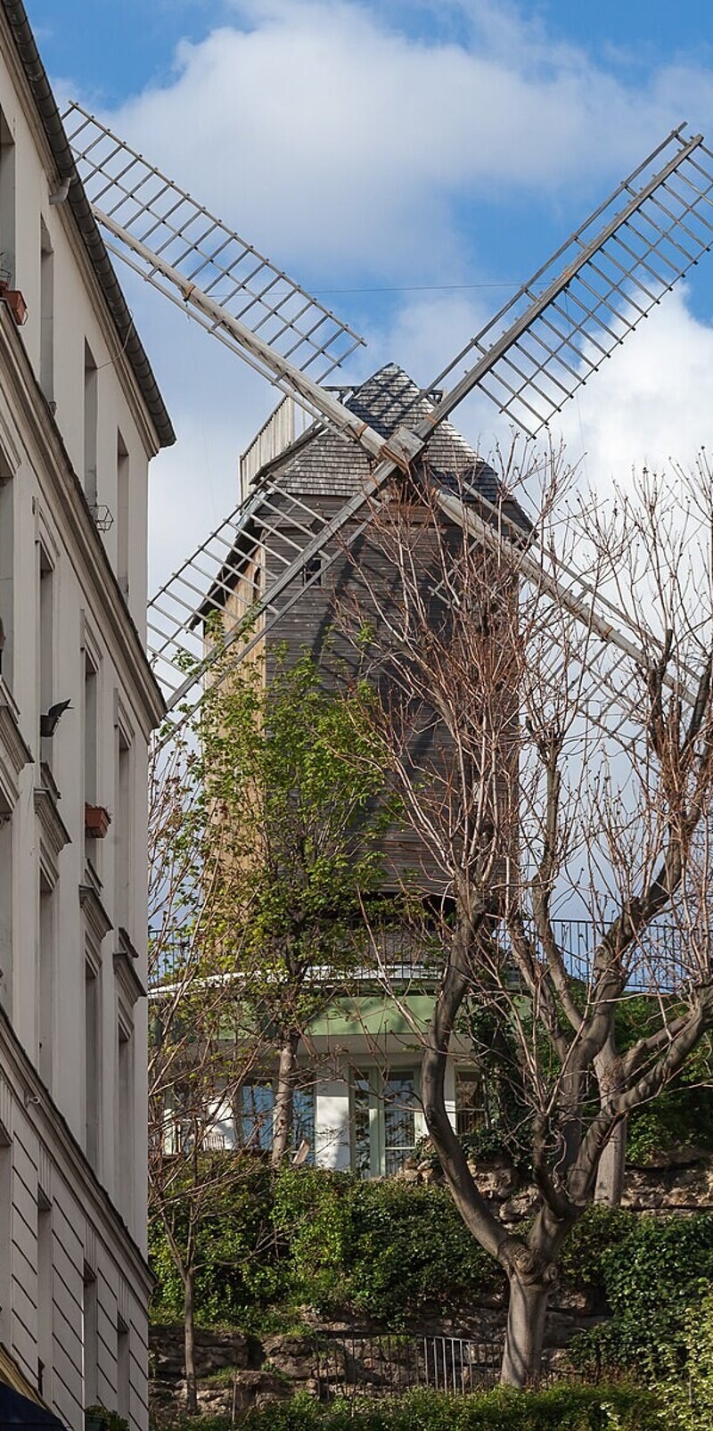 Het hoogtepunt van de Rue Lepic ligt verscholen achter een ijzeren hek en is amper zichtbaar tussen het groen van struiken en bomen: ‘Le Moulin de la Galette’ of met de originele naam ‘Le Moulin du Blute-Fin’. In prachtige schilderijen vereeuwigd door Renoir, Van Gogh en Toulouse-Lautrec, met een geschiedenis die teruggaat tot 1622, is dit één van de slechts 2 overgebleven molens van Montmartre. De molen kende een bewogen levensloop van windmolen naar taverne met goedkope wijn en koekjes van roggemeel - galettes genoemd in ’t Frans. Later werden er vrolijke dansnamiddagen georganiseerd en was de molen een ontmoetingsplaats voor schilders en dichters. Nu is de 'Moulin de la Galette' privébezit en architecturaal erfgoed op de monumentenlijst.