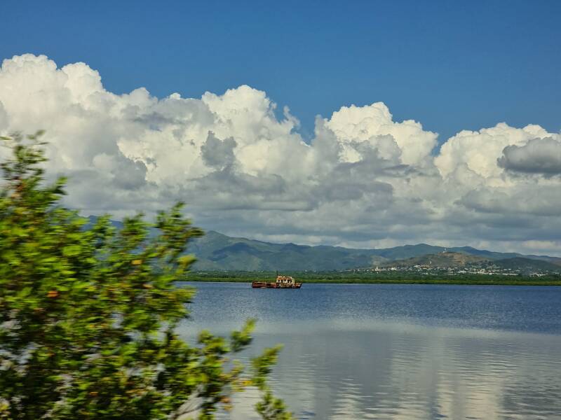 Daarna gaat het regelrecht naar de beste Caribische zee - zand - strandplek, langs moerassen en mangroves en een roestig zinkend schip in de baai.