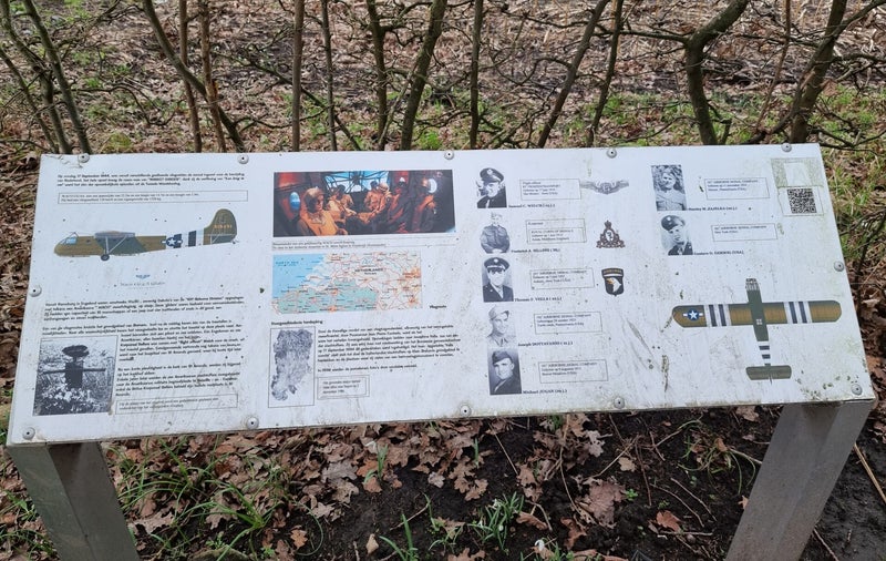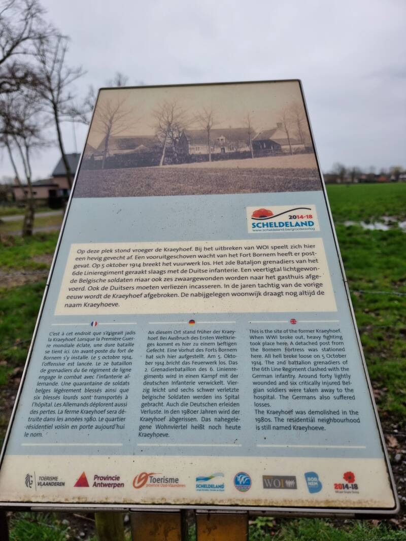 Het Glidermonument, weggestopt onder kale bomen, is een eerste verwijzing naar een wereldoorlog gebeurtenis. Hier stortte in 1944 een Amerikaans zweefvliegtuig neer met als treurige balans de dood van alle 7 inzittenden. Wat verder op de weg zijn alle sporen van de gevechten aan de Kraeyhoef tijdens WO I voorgoed opgeslokt door het omringende landschap. Er rest enkel het infobord als stille getuige.
