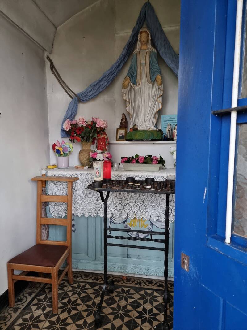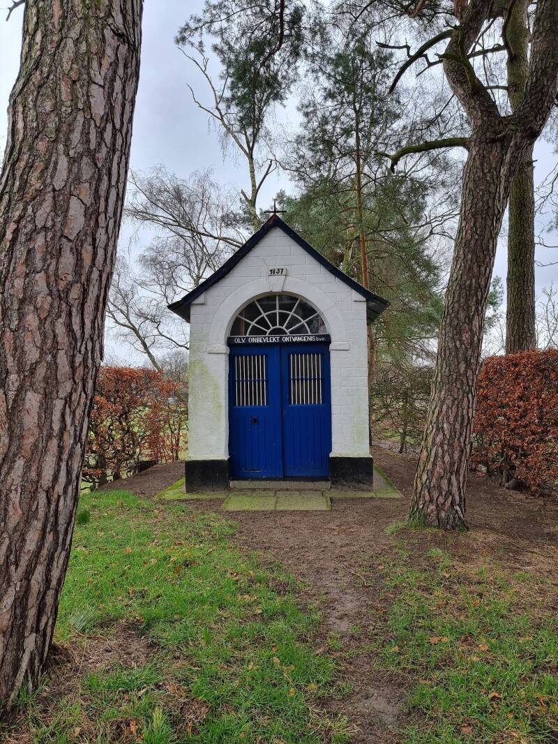 De bewoonde wereld is nooit erg ver in Vlaanderen, het wandelpad gaat achter de tuinen van de Bornemse burgers door, maar ook kapelletjes zijn nooit erg ver. We spotten een mooie in wit en blauw uit 1837. Een voorzichtig duwtje aan de deur laat ons ook stilletjes binnenkijken.