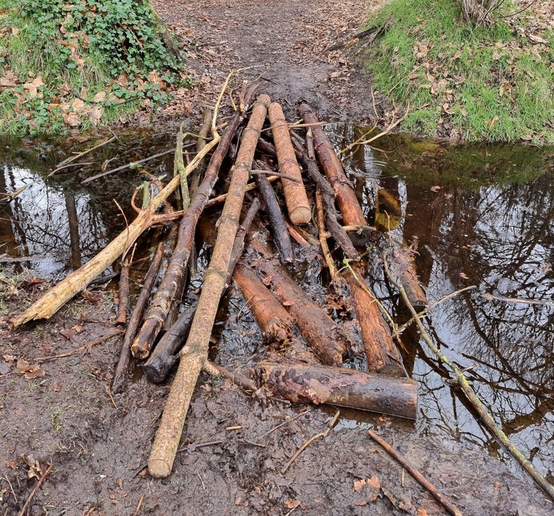 Dwars door de velden komen we terecht in Speelbos Nonnenbos, een heerlijk stukje natuur met de onvermijdelijke sloten en plassen waar we deze keer (gelukkig) zonder natte voeten over geraken (met dank aan de aanwezige boomstammetjes). Kreken en beken lopen in rechte streepjes door het drassige groen: dit is het gebied van de oude Schelde en de Scheldemeersen.