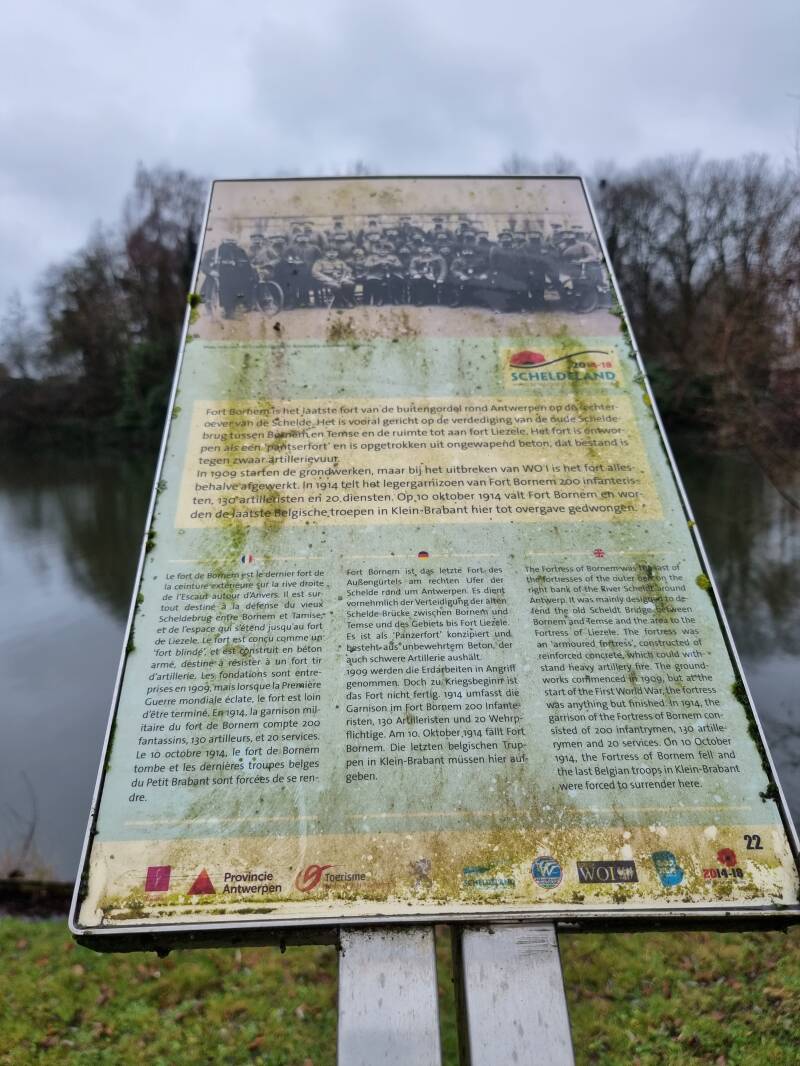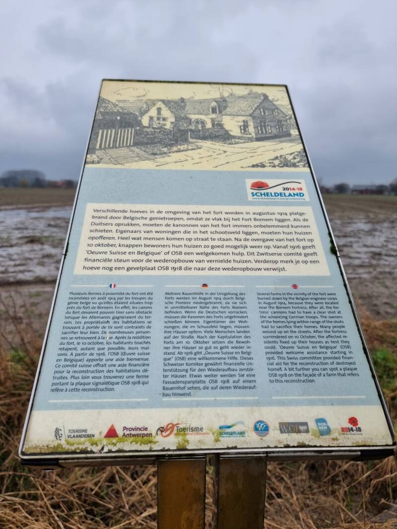 Rustige plattelandsstraatjes en kapelletje nummer 2, veldwegen en een infobord over platgebrande boerderijen in WO I, de kilometers tikken gezwind aan! We naderen het Fort van Bornem en voor commandant Rasquin willen we graag een omweg maken. Het fort zelf ligt immers niet aan de knooppuntenroute maar in een zijstraat. Vakantiehuisjes langs de oevers van de brede walgracht, vissers en een cafetaria, het fort van Rasquin is 110 jaar na zijn dood (hij pleegde zelfmoord) een plek van ontspanning geworden.