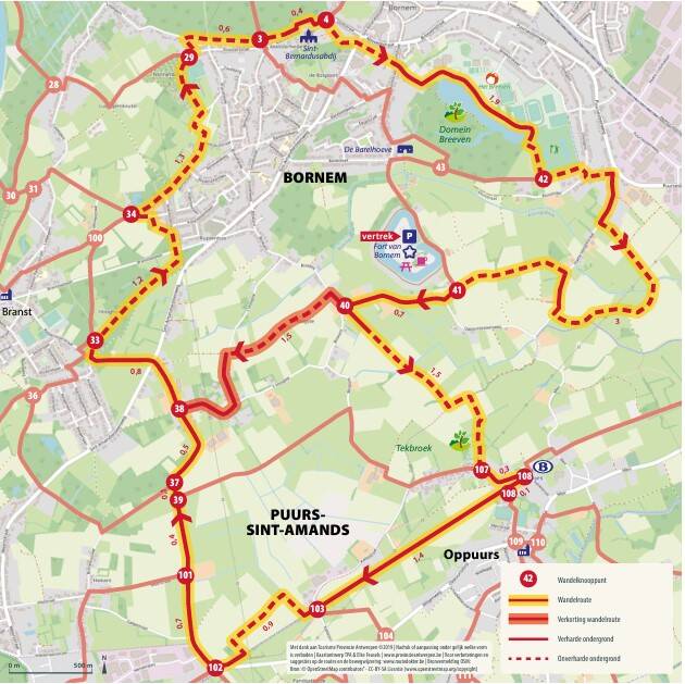 Anders dan vermeld op de site van routen.be, begint deze wandeling niet aan het Fort van Bornem maar aan knooppunt 102 en dat vind je schuin tegenover café ‘De Waggel’ in Puurs-Sint-Amands, een prima startpunt want er is parking aanwezig en een nog beter eindpunt want hier drink je de perfecte warme chocolademelk.