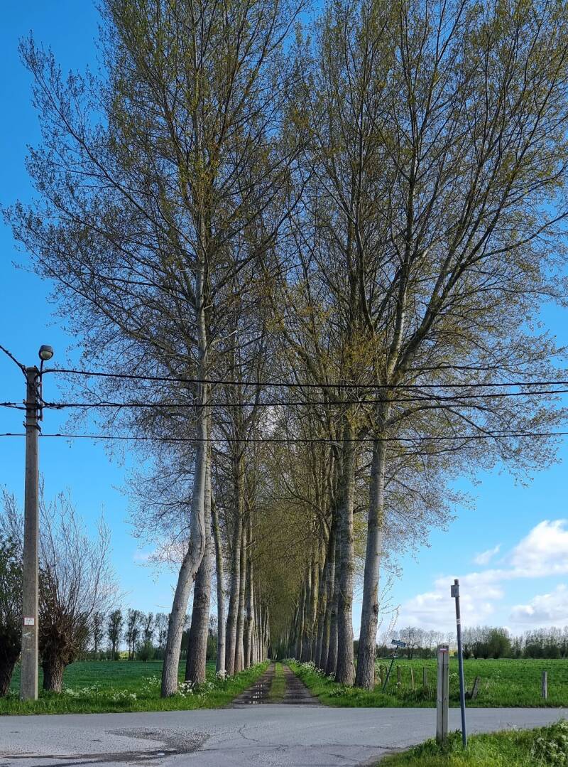 Wit-rood stuurt ons naar een weggetje met de verwarrende naam De Panne, over een private oprit en langs een omgeploegde akker, de geur van het platteland. Een gravelweg volgt, omlijnd met hoge populieren die recht als kaarsen naar de blauwe hemel wijzen.