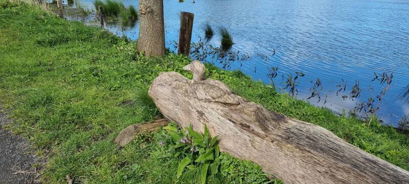 Met zicht op de kerktoren van Ver-Assebroek stappen we nog een eindje verder tot de honger en een vrolijk versierde zitbank/boomstam aankondigt dat het dringend lunchtijd is. Koffietje erbij, broodje erbij, even geen beweging maar een pauzemoment zodat we rustig de tijd kunnen nemen om al het schone rondom ons te bewonderen.