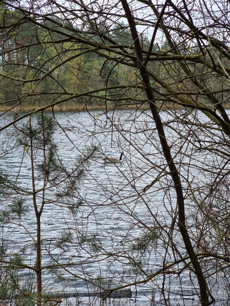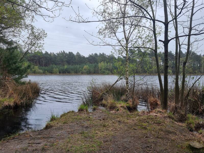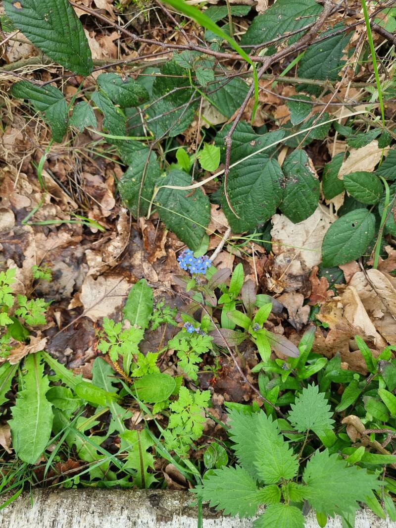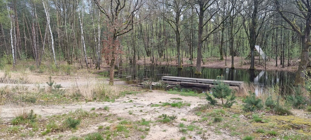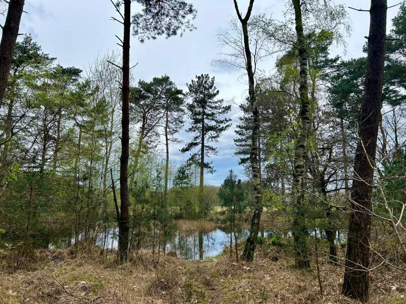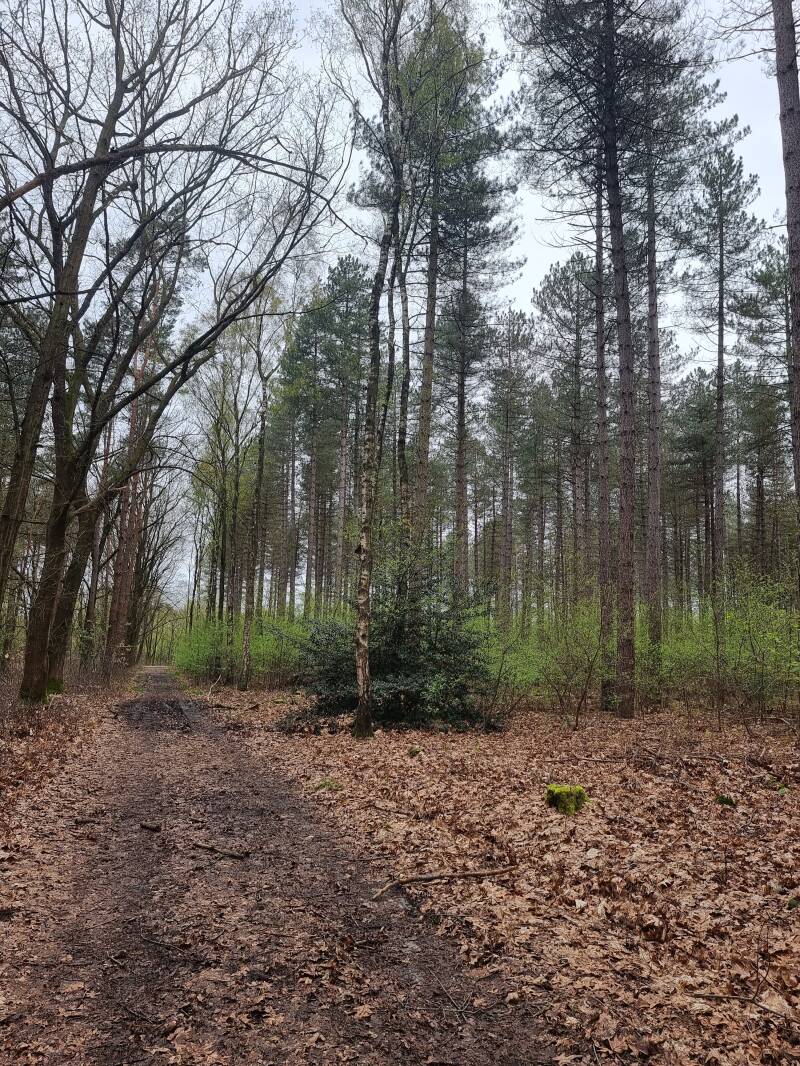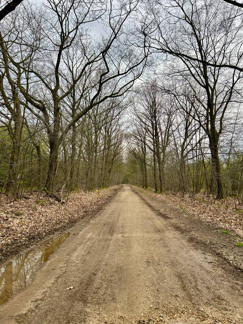 Nog meer poeltjes en de eerste voorzichtige lentebloemen: een dappere paardenbloem, een onzeker vergeet-mij-nietje en een trotse paarse judaspenning. We stappen door lange rechte dreven en genieten van de eerste wazig groene blaadjes aan de takken. Een verdwaalde kijkhut met wankel trapje wordt getest maar niet echt veilig bevonden. Een gemiste kans om vogels of wilde dieren te spotten. Trouwens, het bos is uitzonderlijk stil vandaag en andere wandelaars komen we amper tegen.