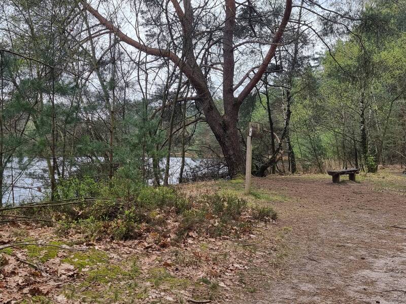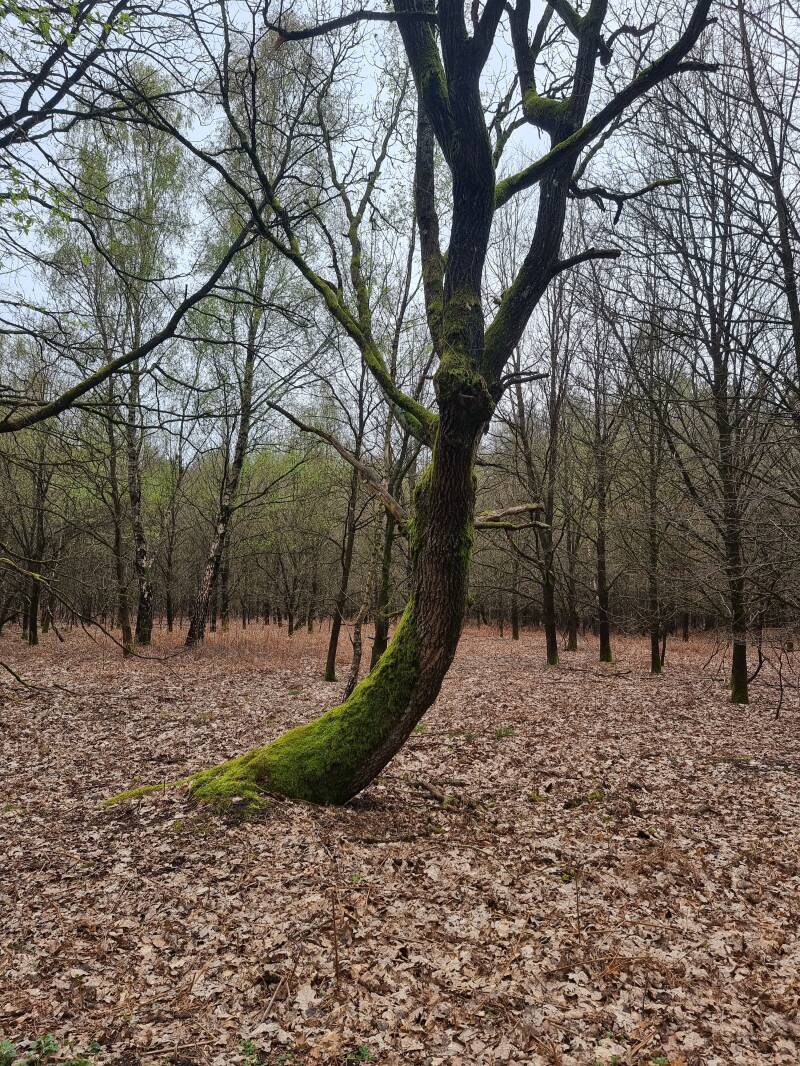 Daar gaan we, richting de Ophovenderheide, langs een tafereel in laagjes opgebouwd met gras en heidestruiken en jonge pas aangeplante naaldboompjes en hoge dennen. Tussen de nog kale loofbomen, een waterplas. Dat verklaart de drassige grond en modderige paadjes. In die vochtige omgeving ontdekken we berkenbomen waarvan de stam decoratief getooid is met een paddenstoelenladder.