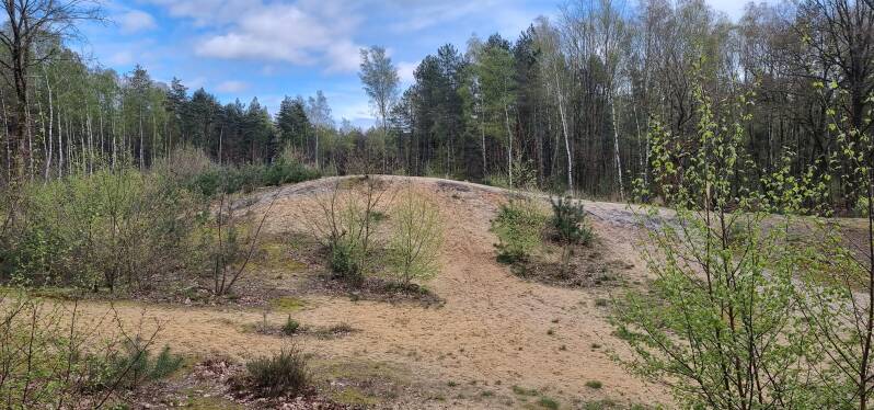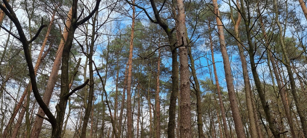 Hoog boven ons reiken de stammen tot aan de blauw met witte lucht, verderop wisselen kale akkers en grasweiden elkaar af. Een stukje asfalt, daarna terug bos en heide en lanen en dreven en van alles wat om te stranden, letterlijk, in het zand aan de voet van de hoogste en grootste landduin van Vlaanderen: de Oudsberg.