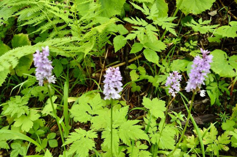 Een behoorlijk drassig stuk wandelpad toont aan dat er nog steeds sneeuwsmeltwater van de bergen naar beneden komt. Uit het bos verandert het landschap in een open kom, afgesloten door een massieve, kale, gelaagde rots Les Terres Maudites die aansluit op de puntige, bleekgrijze toppen van Les Dents Blanches. Een onverwacht mooi panorama!