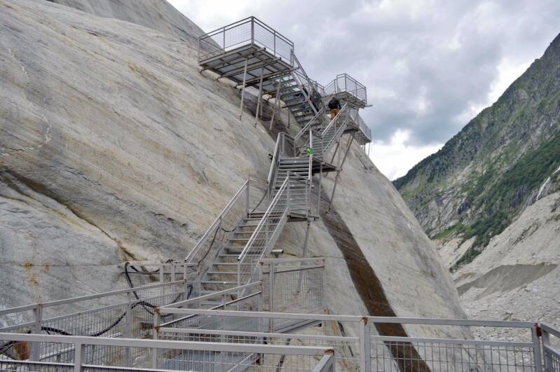 De wandelroute daalt verder naar Montenvers en La Mer-de-Glace op 1913 m. Dit is de langste gletsjer in de Franse Alpen (12 km lang - 420 m diep). Ieder jaar wordt aan het einde van de gletsjer, een ijsgrot uitgehakt, die bezocht kan worden. Hier zijn de gevolgen van de klimaatopwarming, jammer genoeg, erg duidelijk. Waar de gletsjer vroeger tot voorbij het stationnetje van de tandradbaan van Montenvers kwam, zijn er nu een lift en een aantal trappen naar beneden nodig om uiteindelijk tot bij de gletsjer te geraken. Ondanks een flink stuk smaller en korter dan vorige eeuw, blijft La Mer-de-Glace imponeren en een wandeling door een ijsgrot is een echte belevenis.