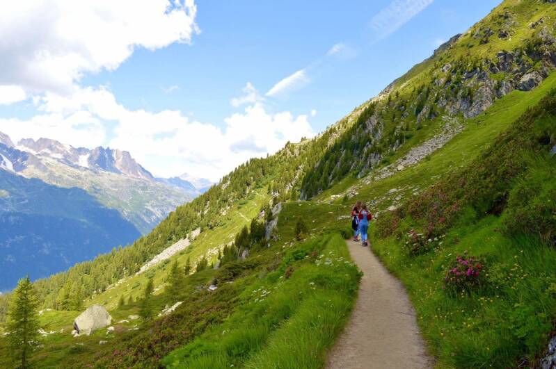Aan het tussenstation van de kabelbaan vertrekken verschillen wandelingen maar de meest populaire is toch wel deze via Le Grand Balcon Nord naar Montenvers. Een goed onderhouden, goed aangeduid maar rotsig wandelpad, weinig hoogteverschillen, schitterende uitzichten, heel veel alpenroosjes en een wijds panorama over Chamonix dat als een lappendekentje in de diepte zichtbaar is.