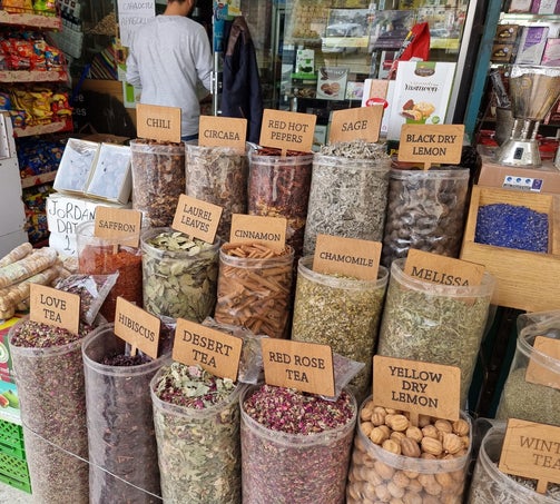 * En dan nog deze: de overal aanwezige Jordaanse vlag - de grappige, gekleurde bestelwagentjes – de winkeltjes langs de kant van de weg waar meer buiten staat dan binnen – de grappige Engelse bordjes naar de ‘Best View’, de ‘Why Not Shop’ of de ‘Aldi Coffee’ - de rijen bloemkool, bakken tomaten en stapels radijsjes langs de straten – de kleuren van de kruiden en de geuren van de soorten thee – de vriendelijke en behulpzame mensen en nog heel veel meer …