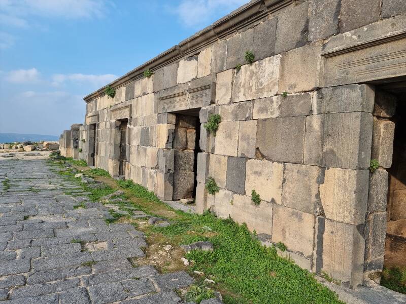 Een rij, vermoedelijk, winkeltjes ligt langs een zijstraat van de grote hoofdstraat of decumanus. Deze loopt van oost naar west doorheen het oude Gadara en was een deel van de handelsroute van Syrië naar de Middellandse Zee. Een ongewoon gevoel om nu in de 21e eeuw over diezelfde straatstenen te lopen waarin je nog duidelijk de Romeinse karresporen ziet. Indrukwekkende zuilen links en rechts van de straat onderstrepen de belangrijkheid ervan.