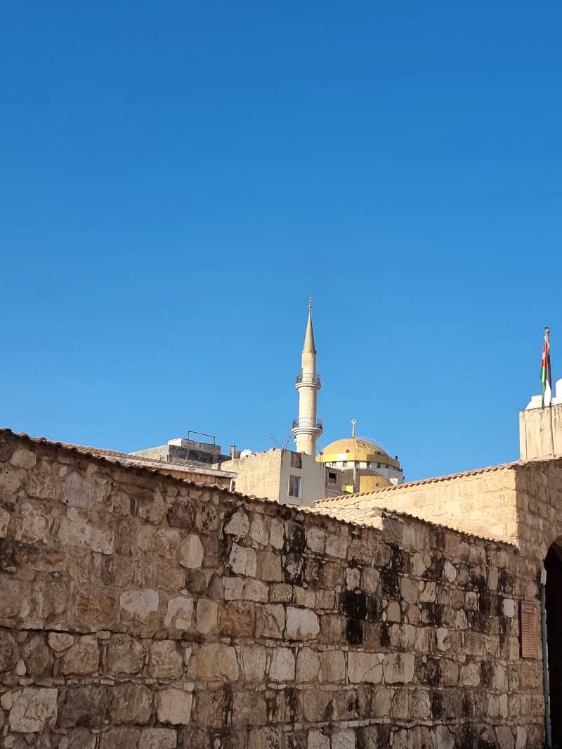 De stad van de mozaïeken, bekend geworden door de ontdekking van wat de oudste landkaart van Palestina is, ligt er op deze vroege ochtend nog rustig bij. Toeristen hebben de weg naar Jordanië nog niet teruggevonden! Daardoor hebben we het meest populaire gebouw in Madaba, de Grieks-orthodoxe kerk Saint George, zowat voor ons alleen. Wat is er nu zo bijzonder aan deze kerk die er aan de buitenkant niet speciaal uitziet met zijn simpele zachtgele gevel en open klokkentoren? De werkelijke schat ligt binnenin, toevallig ontdekt door arbeiders die in de 19e eeuw de ruïnes van een Byzantijnse kerk opruimden om er de huidige Saint George te bouwen. Onder de brokstukken vonden ze een eeuwenoude mozaïek die, ondanks aardbevingen en oorlogen, nog erg goed bewaard gebleven was.