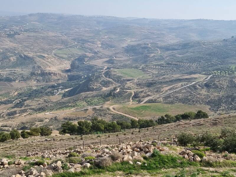 Bij helder weer heb je, vanaf het uitkijkpunt, een 180 graden zicht van de Dode Zee tot aan het Meer van Tiberias met daartussen heel wat bekende Bijbelse steden, dezelfde steden die terug te vinden zijn op de mozaïekkaart in Madaba. Maar dat heldere weer hebben wij jammer genoeg niet – wij worden elke keer geplaagd door mistig, heiig weer waardoor de zichtbaarheid miniem is.
