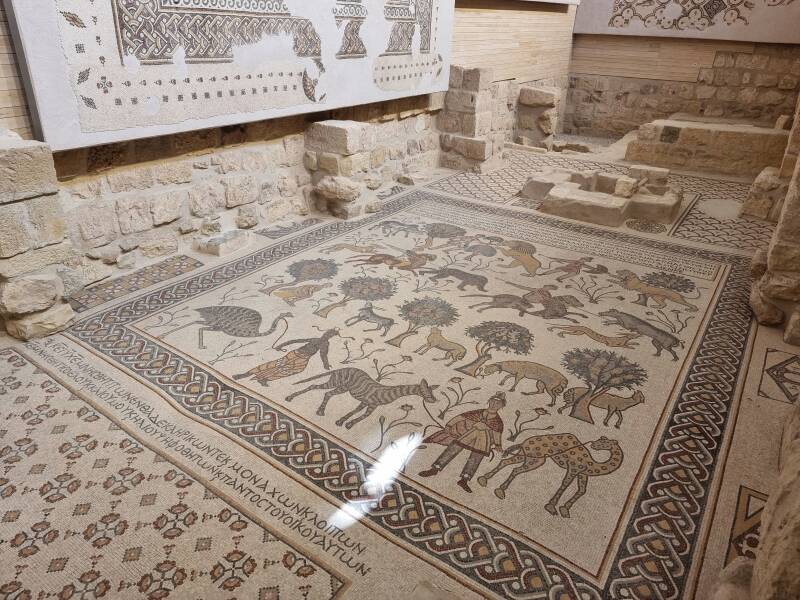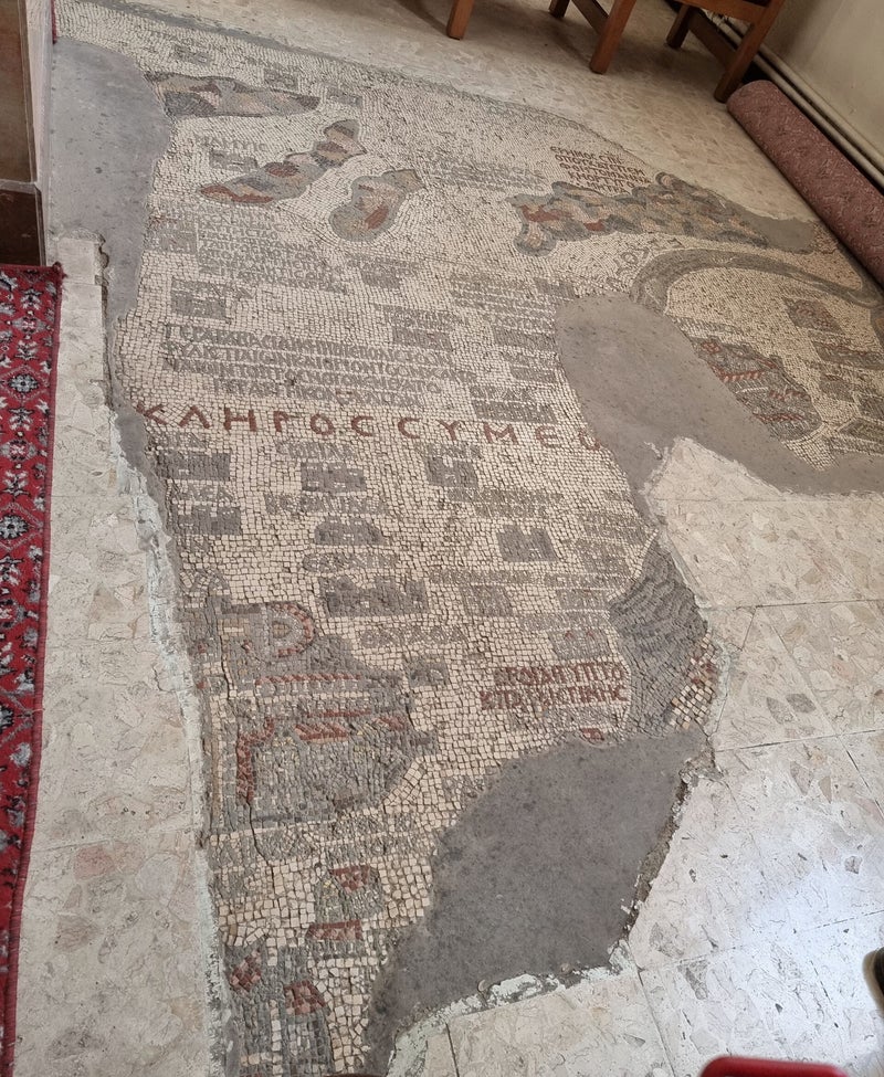 Een beetje stoffig, links vooraan in de kerk, omgeven door opgerolde tapijten en kettingpalen (want de kerk wordt nog gebruikt), ligt dan die unieke, historisch waardevolle mozaïek. Een mens wordt er een beetje stil van. Bijbelse plaatsen zijn ineens meer dan enkel namen uit lang vergeten verhalen. Hier liggen ze al eeuwen gevat in hele kleine gekleurde steentjes.