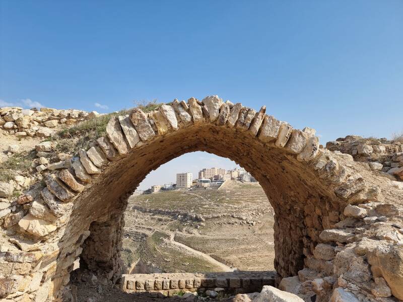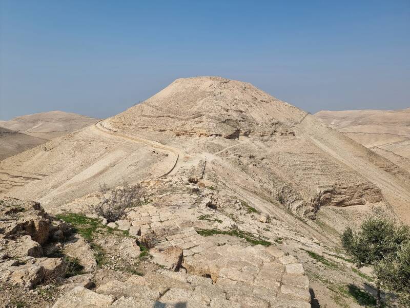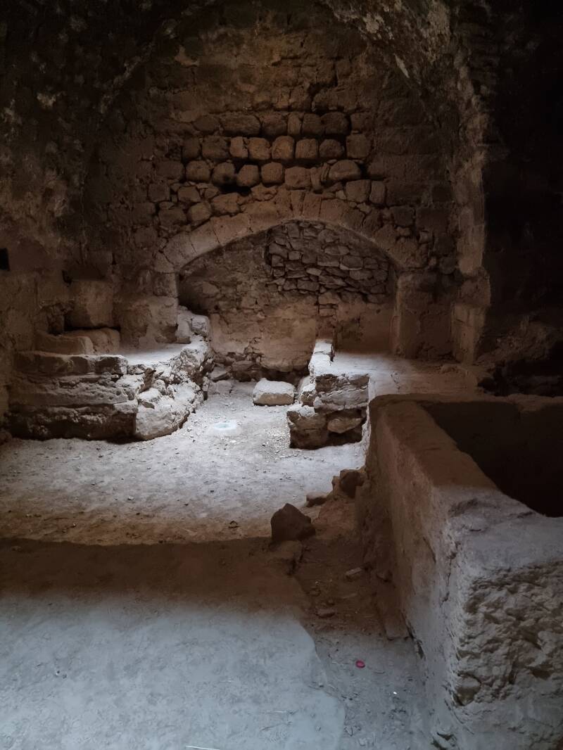 Een restje muren en 2 zuilen, dat blijft er nog over van het ooit versterkte fort en paleis. De grot waar Johannes de Doper gevangen zat, is nu een schuilplaats voor een nomadenherder. De lange wandeling en de klim naar de top schrappen we maar van het lijstje. Een blik vanuit de verte, een gedachte aan die onfortuinlijke Johannes en wat foto’s als herinnering zijn voldoende om ons toeristenhart tevreden te stellen.