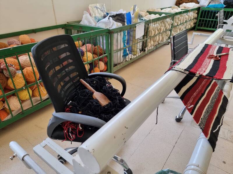 In de kleine galerie kan je genieten van Jordaanse traditionele kleuren en vormen die tapijten, lopers, kussenovertrekken en decoratiespullen sieren. Blauw, oranje, rood, groen … dikke bollen schapen- en geitenwol liggen in bakken klaar om verwerkt te worden tot dat wat tot het erfgoed van de Bani Hamida behoort: het weven van tapijten.