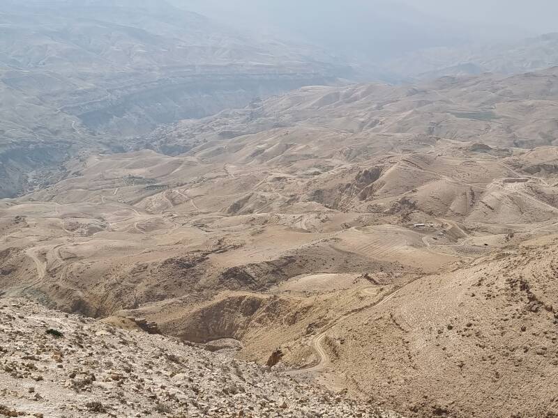 Een 700 m diepe kloof onder ons, geplooide zandkleurige bergen rond ons, een 1.100 m steile hoogte voor ons en ergens daartussen kronkelt de Mujib rivier zich een weg naar de Dode Zee die 410 m onder zeeniveau ligt. Letterlijk van hoog naar laag, een mens wordt er een beetje duizelig van!