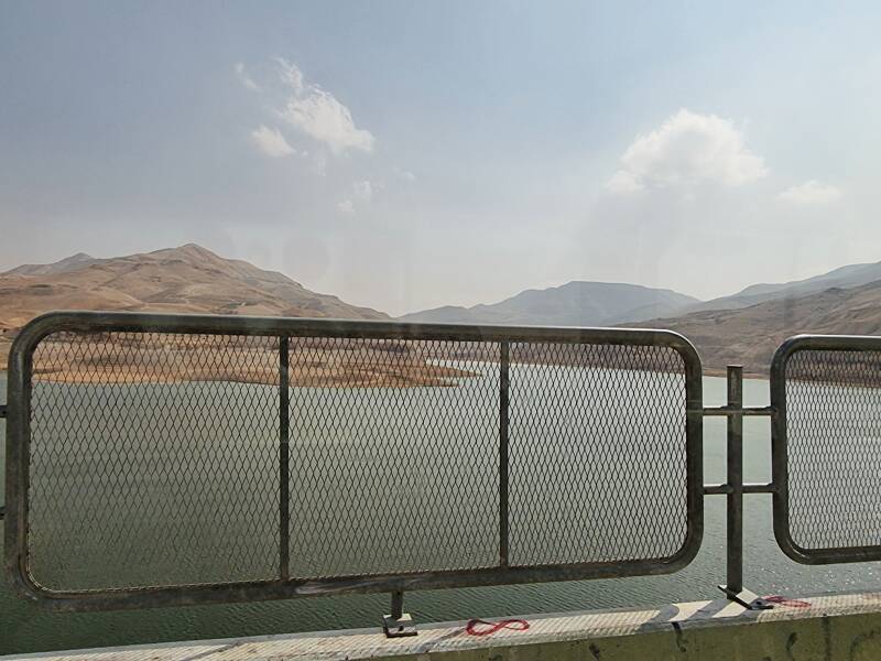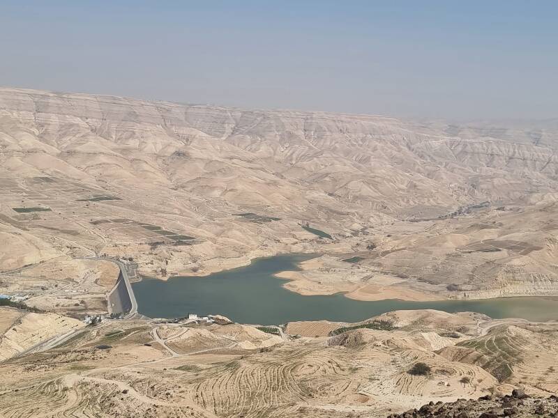 Een paar bochten verder duikt de King’s Highway, als een slingerende bergweg, naar beneden. Tijd voor een tweede stop, deze keer met zicht op de Al Mujib dam en de donkergroene watervlek van het stuwmeer. Een rit omlaag betekent, nogal logisch, dat we aan de overkant van de dam terug de hoogte in moeten, met nog meer adembenemende vergezichten.