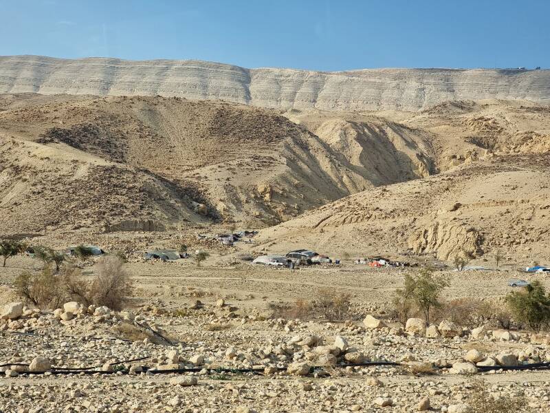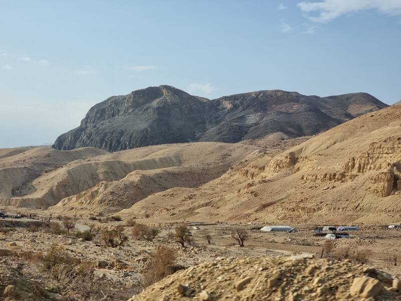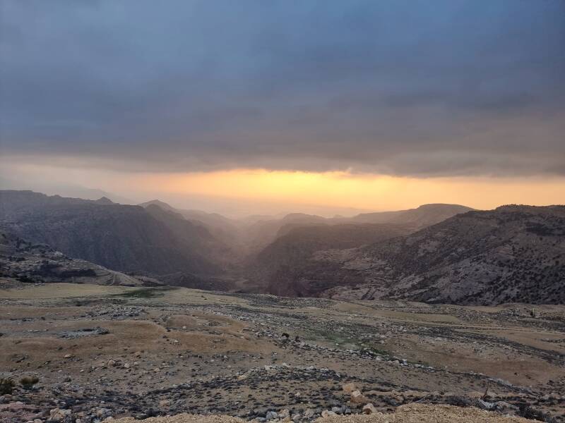 Nog meer fotogenieke views richting Dana, onze logeerplek voor vanavond en morgen. De bewoonde wereld lijkt ver weg. Een glimp van bedoeïenenkampen in de verte, hun tenten en kuddes en pick-ups verspreid over een desolaat berggebied, een imposante zwarte basaltberg, kleine dorpjes en een volmaakte zonsondergang, een fantastische afsluiter van deze boeiende dag!