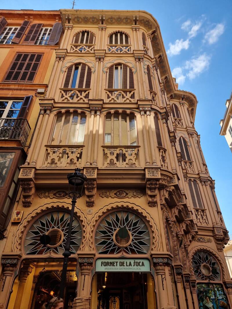 Dit is waarschijnlijk een van de meest opvallende gebouwen in Palma, gebouwd eind 19e eeuw, net voor de modernista stijl populair werd. Alle decoratie op de gevel is gemaakt uit hout en vooral de veelkleurige glas-in loodramen zijn heel apart. De bovenverdieping is een roze opzet met torentje maar onmogelijk om dit goed op foto te krijgen van op de straat.