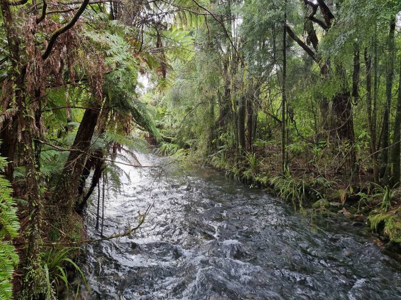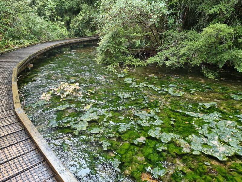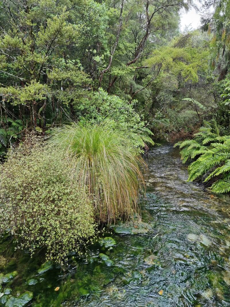 De walkway naar de bronnen, deels over houten vlonders, leidt je door een schilderachtig natuurgebied van manukastruiken, kanukabos en grote varens, over snelstromende riviertjes en langs vijvers vol groene waterplanten. In de stilte klinkt plots het geluid van een weka en ja hoor, aan de kant van het pad zien we een mama weka met 2 donzig bruine kuikens. Een momentje van paniek wanneer baby weka nummer 1 achterblijft en met veel drama gevonden wordt door mama en nummer 2. Snel verdwijnen ze in het struikgewas. Te snel voor een foto.