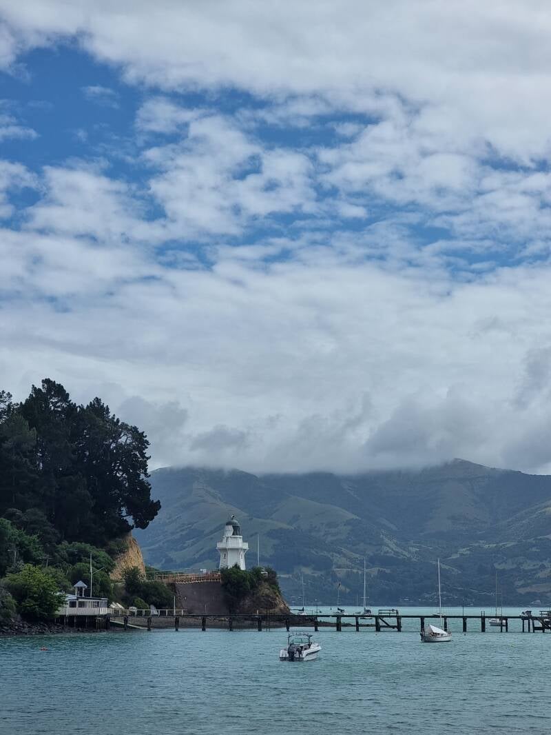 Zelfs het weer ligt dwars en is op z’n Nieuw-Zeelands behoorlijk wisselvallig. Zon en regen en grijs en bewolkt en warm en koud, jas uit, jas aan, trui uit, trui aan. Jammer want op een heldere dag is dit beslist een gezellige plek en kan je in de baai, met een beetje geluk, dolfijnen en zeehonden spotten of je boekt een ‘Swimming with Dolphins’-tocht die vertrekken vanaf de havensteiger. Die Main Wharf, het Akaroa Lighthouse en het Britomart monument, aan de rand van de stad, zorgen voor wat kleine toeristmomentjes.