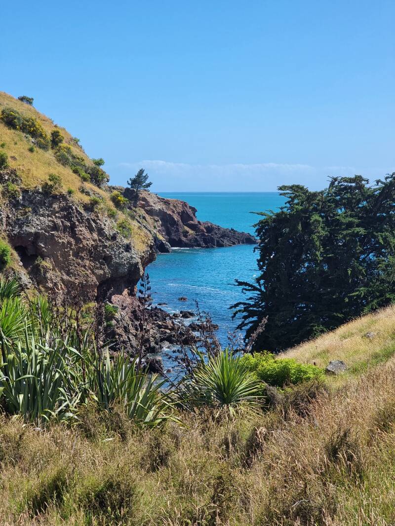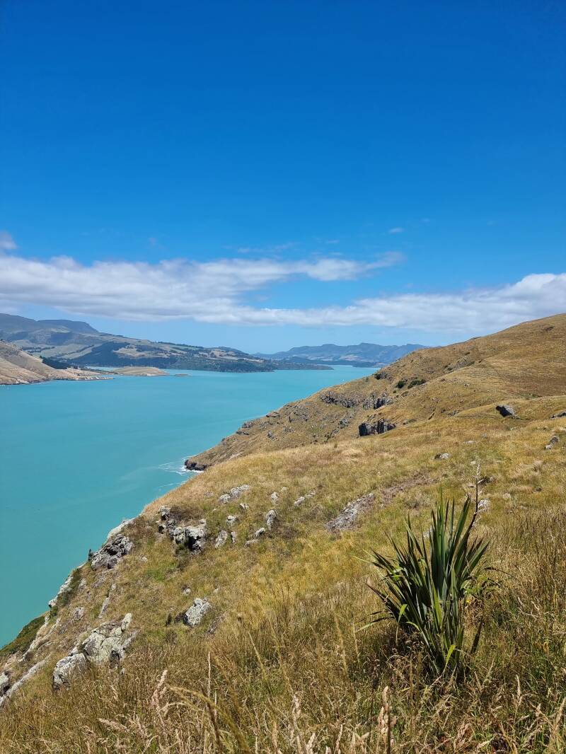 In de verte over het blauwgroene water zie je, met een beetje fantasie, een glimp van de haven van Lyttelton en het schiereiland Banks.