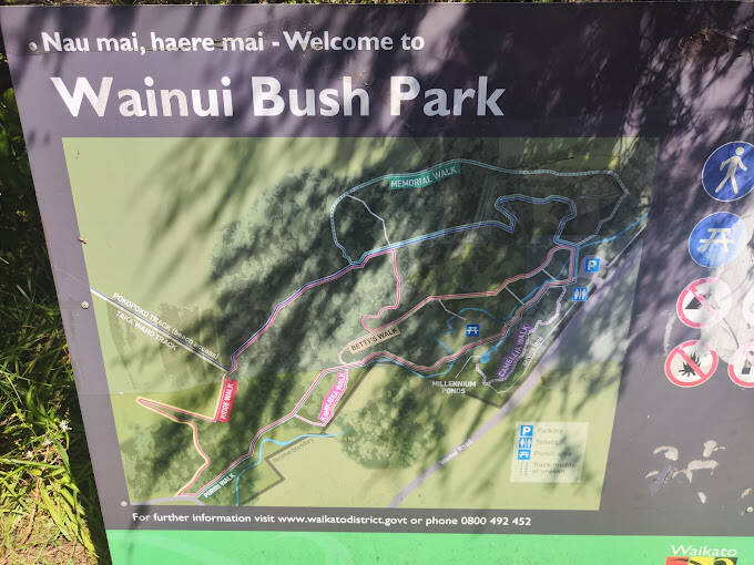 Parkeer over de brug aan het Kaniwhaniwha Reserve car park (toiletten aanwezig)