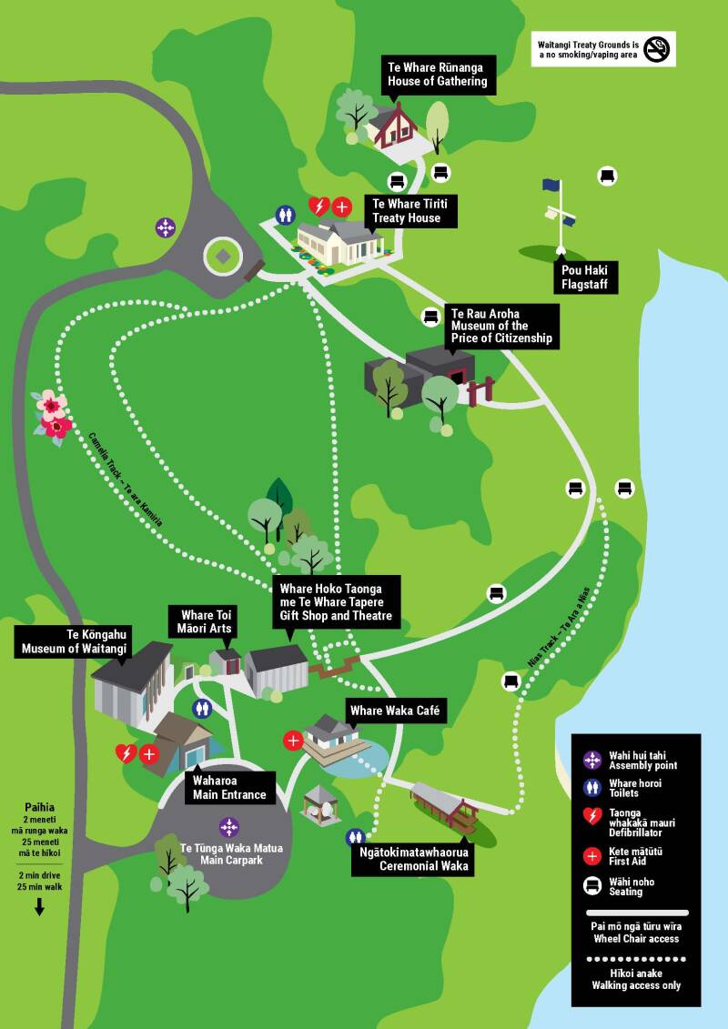 Waar kolonisten een eerste glimp zagen van hun nieuwe land, waar handelaars en walvisvaarders een nieuwe leven trachtten op te bouwen, waar Europese heersers en Māori stamhoofden voor het eerst een verdrag tekenden, daar op die roerige plek (Waitangi betekent ‘huilend water’) is nu een oase van groen en rust gecreëerd, bezaaid met historie en cultuur.