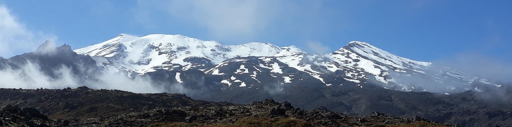 Nog een belangrijk iets te doen: er wordt niet vertrokken zonder een foto van de besneeuwde toppen van Mount Ruapehu, die nu eindelijk uit de wolken tevoorschijn komt!