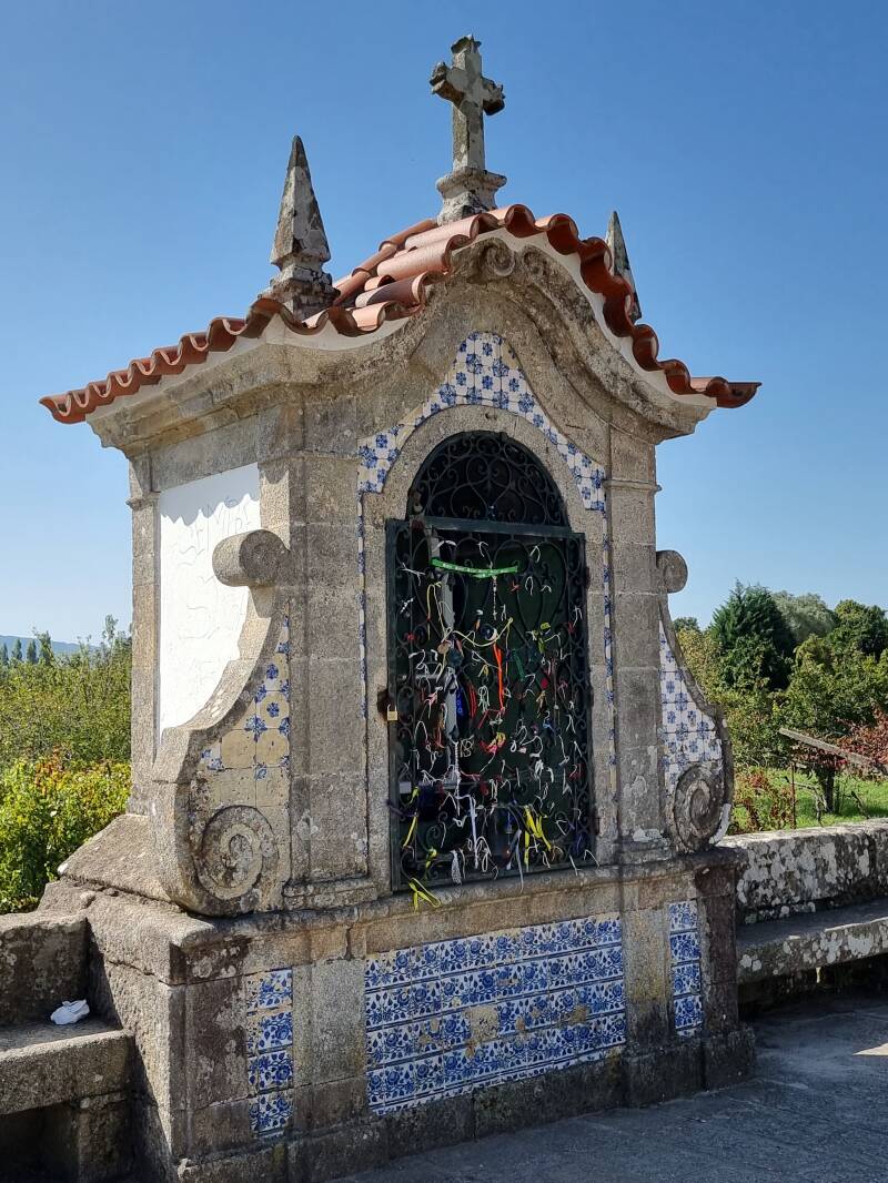 Net voor we het bos uitlopen, merken we nog een ander pelgrimskruis op achtergelaten steentjes, beeldjes en kruisjes. Waarom juist op deze plek is een raadsel. Toch heeft dit kruis blijkbaar iets speciaals voor veel mensen. Nog meer Romeinse hobbelweggetjes en een Romeinse brug, nog meer wijngaarden met boven ons hoofd, een baldakijn van wijnranken waar de stralen van de late middagzon doorpriemen en in de verte, zicht op Aqualonga en de Igreja São Paio … Het Portugese platteland, dat is een beeld van natuurlijke schoonheid!