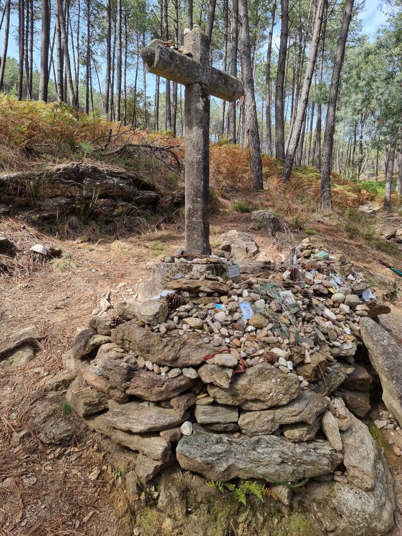 Een verdiende adempauze aan het Cruz dos Franceses of het Cruz dos Mortos waar, volgens de streekverhalen, de achterhoede van het leger van Napoleon in 1809 door de dorpsbewoners in een hinderlaag werden gelokt en gedood. Steentjes, foto’s, beeldjes en schelpen zijn de ontroerende getuigen dat velen voor ons dit verweerde stenen kruis uitkozen als ideale plek voor een stiltemomentje en dat is precies wat wij ook doen.