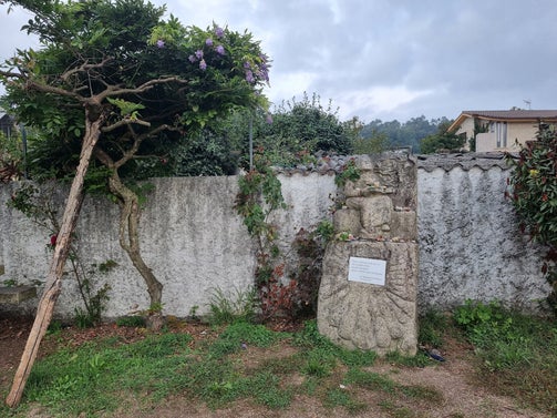 Een drinkfontein, een bankje, een stenen vrouwenbeeld met pelgrimsschelp en tekst over Santiago van María Magdalena Domínguez Domínguez (een bekende dichteres uit Mos), een vrolijke ontmoeting met een groepje drukke Spaanse wandelaars, we stappen lekker door en genieten van het uitzicht op velden en beboste heuvelruggen. Ver van de drukte van steden en snelwegen ligt Mos Castro, een historische plek omringd door het weelderige groen van de Louriña vallei. Pal op de Camino, is het dorpje perfect voor een koffiestop en dat kan nergens beter dan in de Fundación Pazo de Mos. Cappuccino, granenreep en wat gedroogd fruit, een kort genietmoment op het terras, in een schitterend parkachtig kader.