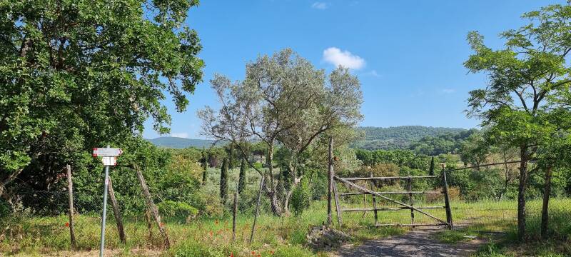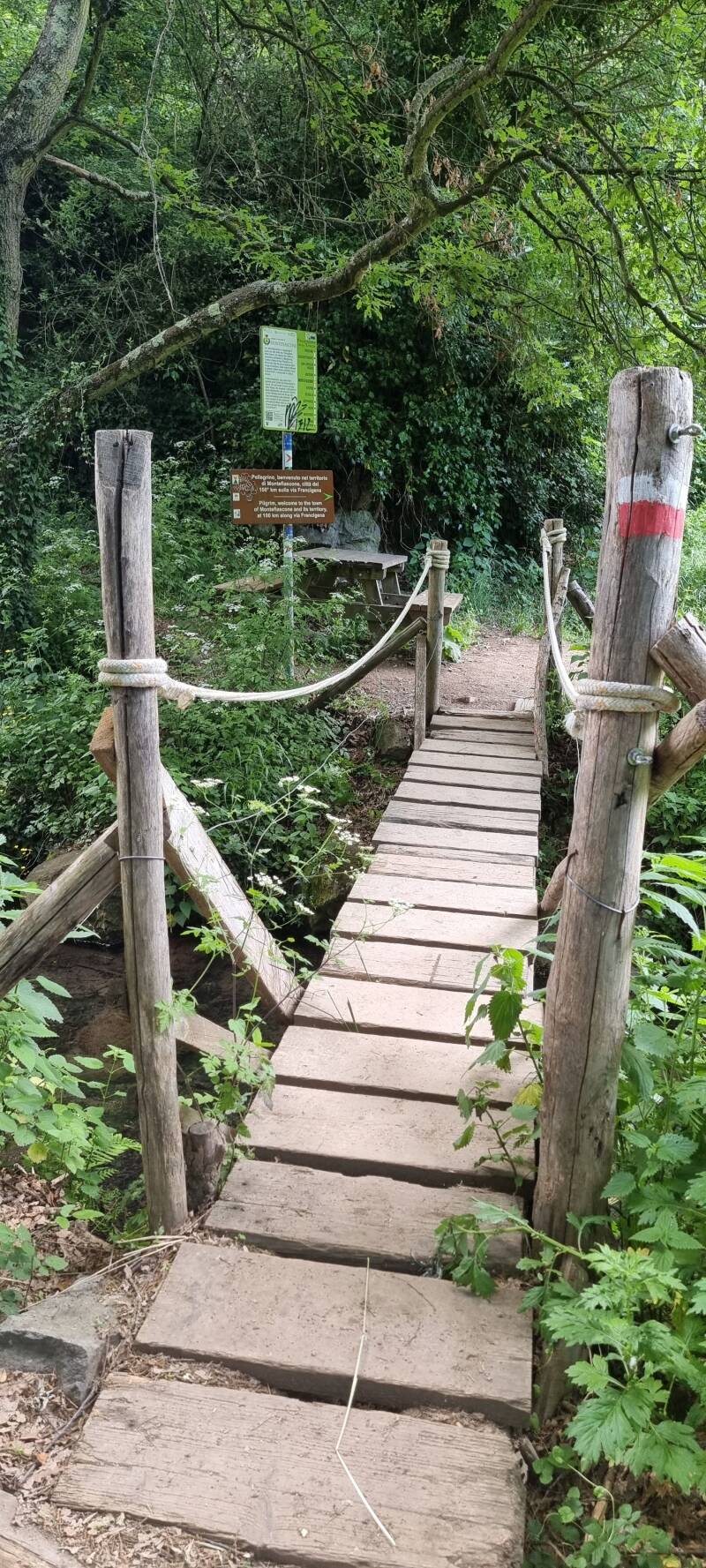We verlaten het grondgebied van Bolsena en een houten loopbruggetje over alweer een andere beek heet ons welkom in Montefiascone. Het dichte bos maakt plaats voor glooiende en zachte vergezichten, zo kenmerkend voor de regio Lazio. Wijngaarden en olijfbomen wisselen elkaar af en de Via Francigena slingert zich door de velden langs zacht ruikende hondsroos.