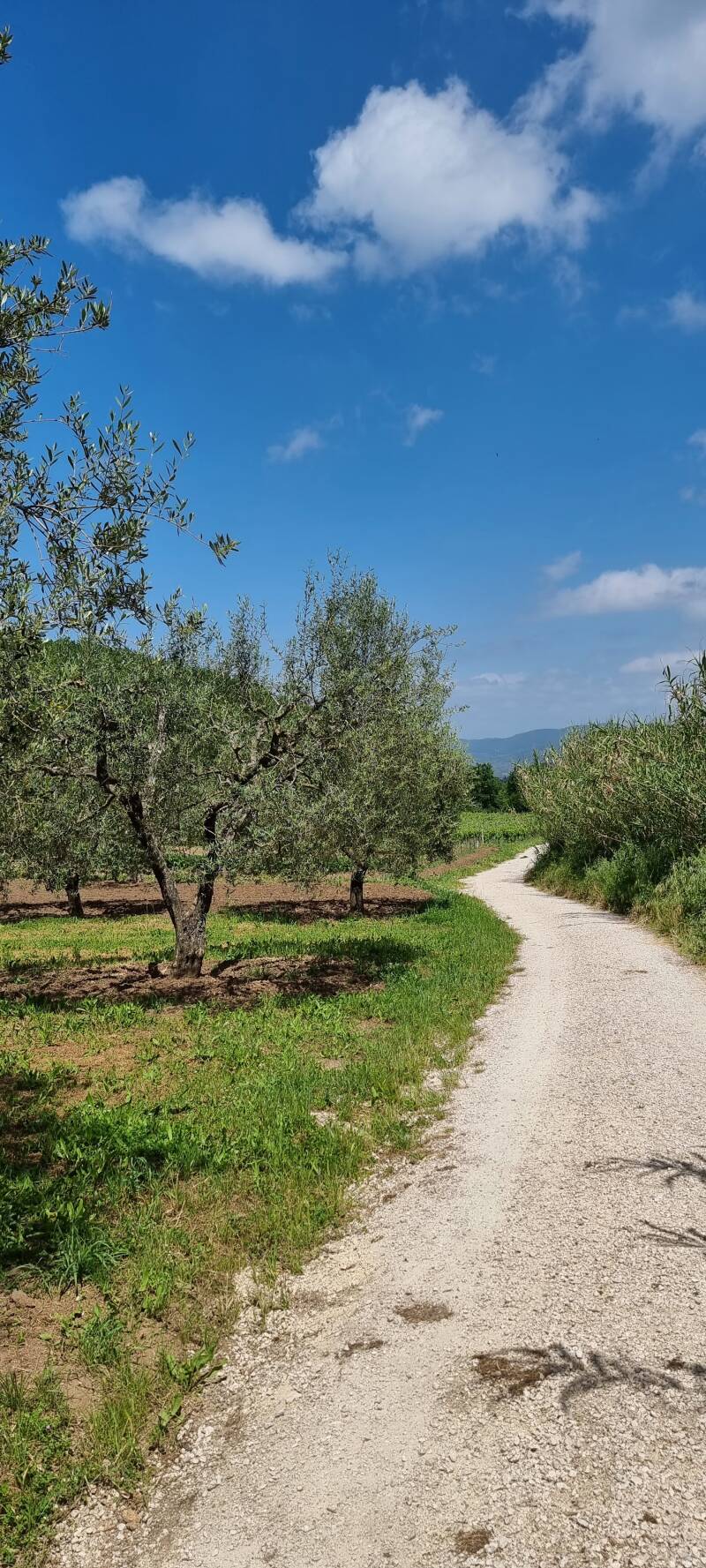 Na een zij-uitstap naar de supermarkt voor een picknicklunch (onderweg is er alleen natuur) gaat de wandeling via een landelijk baantje meteen de hoogte in. Tussen alle tinten groen van olijfbomen, wijngaarden en akkers verrast het blauw van het Bolsena Meer, de ene keer met een flauwe glimp om even later in al zijn pracht breeduit te schitteren.