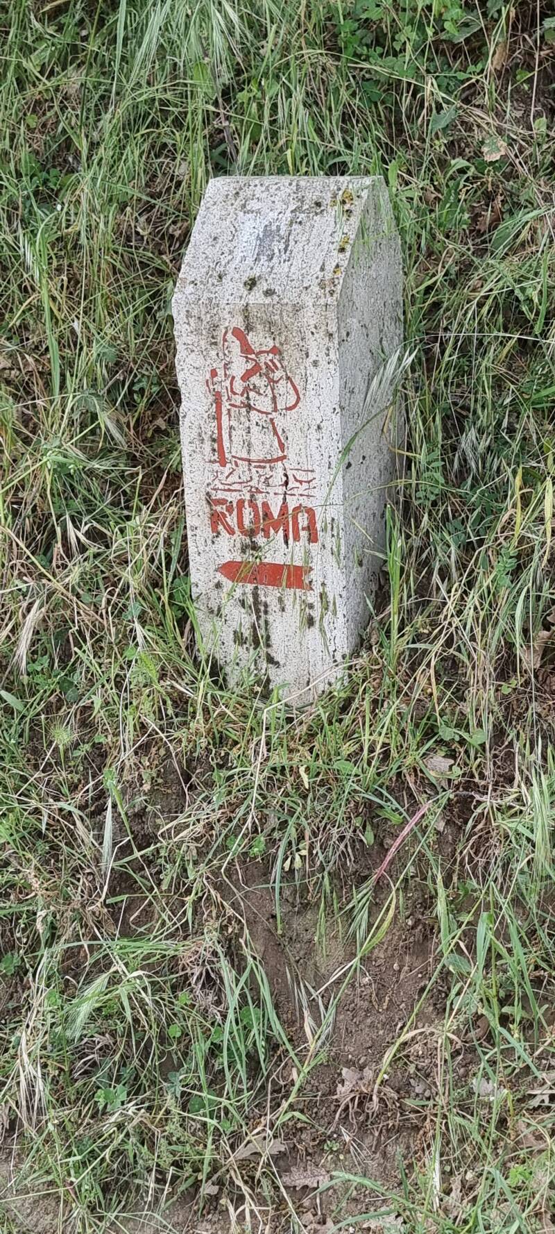 Een warme ochtend, een Italiaans ontbijt, een vluchtige blik op het meer, wat snelle foto’s en daar gaan we. Met de eerste stempel in onze credenziale zijn we op weg naar het officiële beginpunt van de route aan het boomrijke pleintje Largo Salvo D'Acquisto (richting de Basilica) waar we kennismaken met de geelgekleurde pelgrimsfiguur die ons de komende dagen naar Rome zal leiden.
