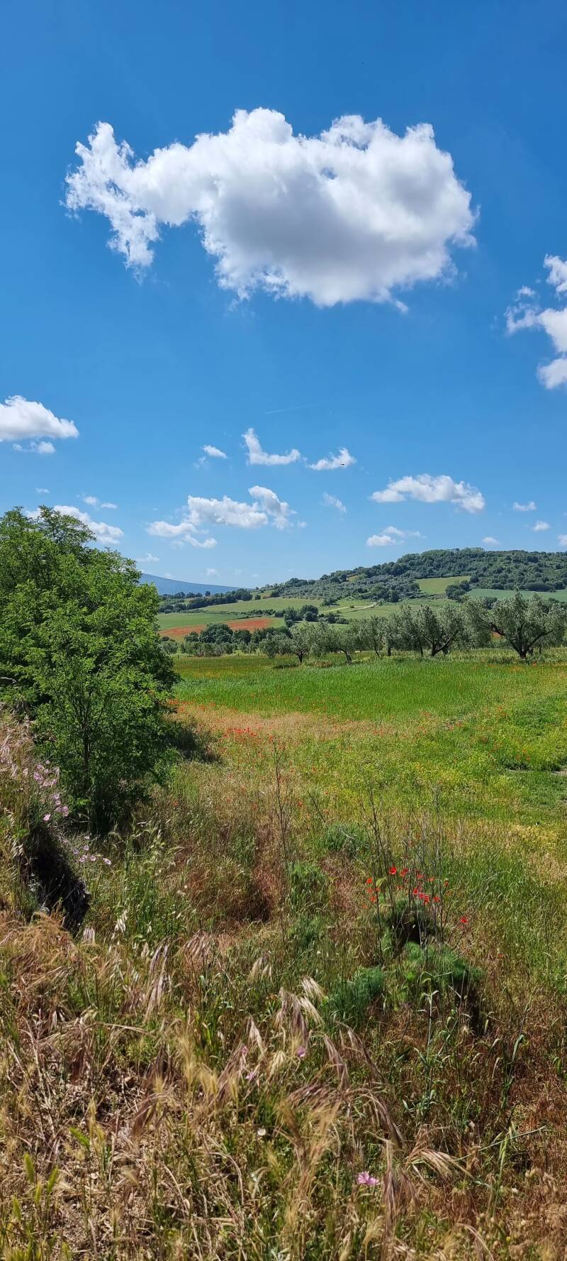 Druivenstruiken en olijfbomen, omzoomd met oude keienmuurtjes, wisselen met golvende akkers, rood van de klaprozen. Voorbij de kapel van La Madonna del Rosario blijven we de Via Cassia Romana verder volgen. Nog steeds dezelfde grote platte keien, die verrassend comfortabel stappen en in een merkwaardig goeie conditie verkeren.