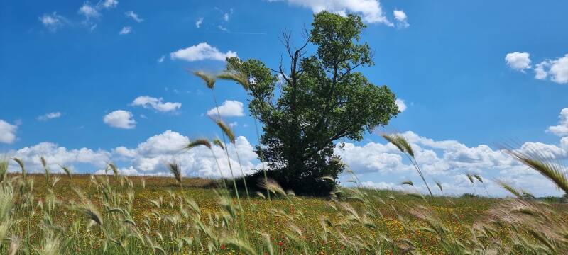 Nog steeds het platteland met wuivend koren, kleurrijke akkerbloemen en een boom alleen. Nog steeds een strak blauwe lucht met decoratieve dikke witte wolken.