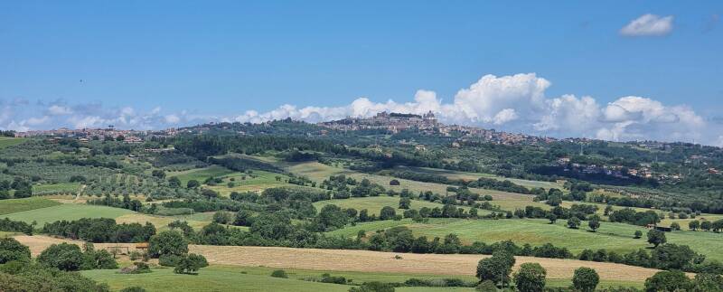 Onder de spoorwegbrug door volgt een van de weinige klimmetjes van deze dag. De beloning? Goudgele hooibalen in de zon en aan de horizon één van de mooiste uitzichten op Montefiascone en Viterbo. Wat een prachtige streek is dit!