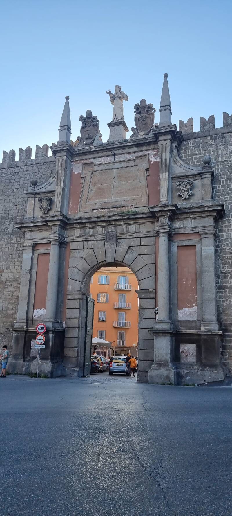Het is nog een flikse wandeling door het nieuwe deel van Viterbo, langs winkels en woonblokken en benzinestations en Il Monumento all'Aviazione Italiana (het Monument voor de Italiaanse Luchtvaart) maar eindelijk ontdekken we oude muren en een wachttoren en de Porta Fiorentina, de toegang tot la città vecchia. Gebouwd in 1768 is dit een waardige inkom voor de Stad van de Pausen.