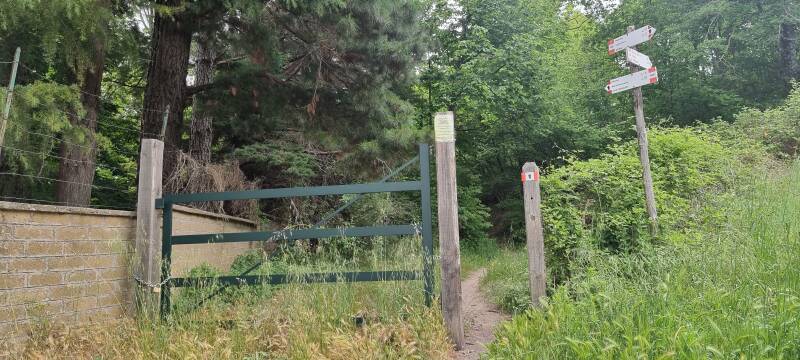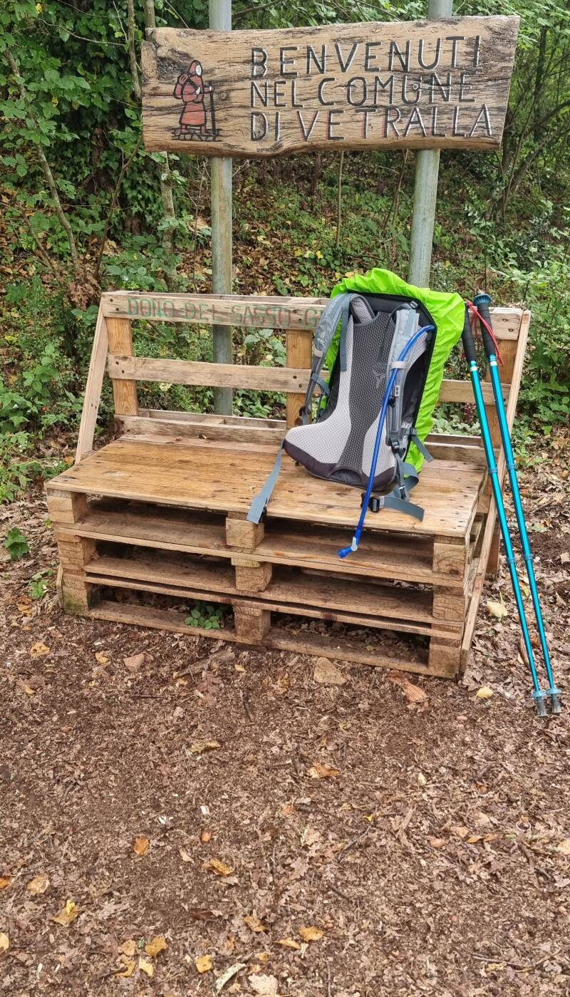 Als een stel moderne pelgrims, nog onder de indruk van de middeleeuwse sfeer, verlaten we het centro storico, langs de resten van de oude abdij en de rijtjeshuizen met hun pittoreske gevels, begeleid door het nu al vertrouwde Via Francigena-figuurtje. Bij de lokale supermarkt vinden we onze volgende stempel en dan gaat het voorbij verweerde muren en trappen richting de bossen van de Monte Fogliano.