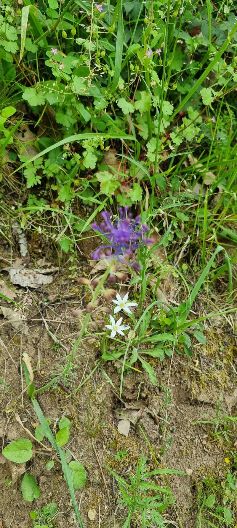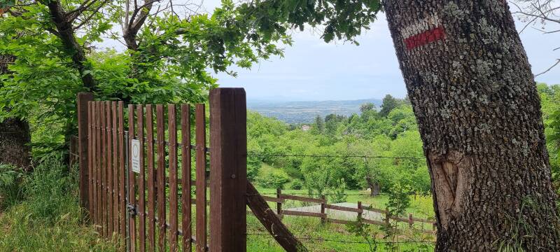 Een steile klim, een kronkelige landweg tussen fruitbomen, hazelaars, kastanjebomen en weilanden. Wat verloren aan de kant staan tere bloemetjes als kuifhyacint en vogelmelk. Af en toe worden we getrakteerd op een fantastisch panoramisch uitzicht. Bij gebrek aan een bankje of een picknicktafel wordt het op de middag een lunch in de graskant.