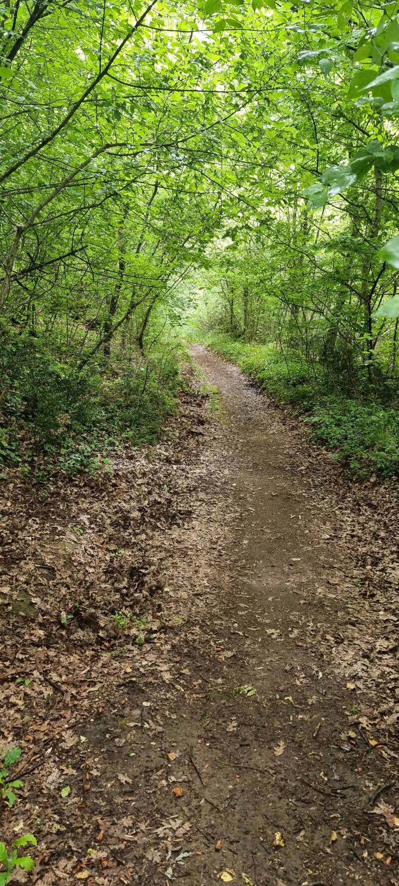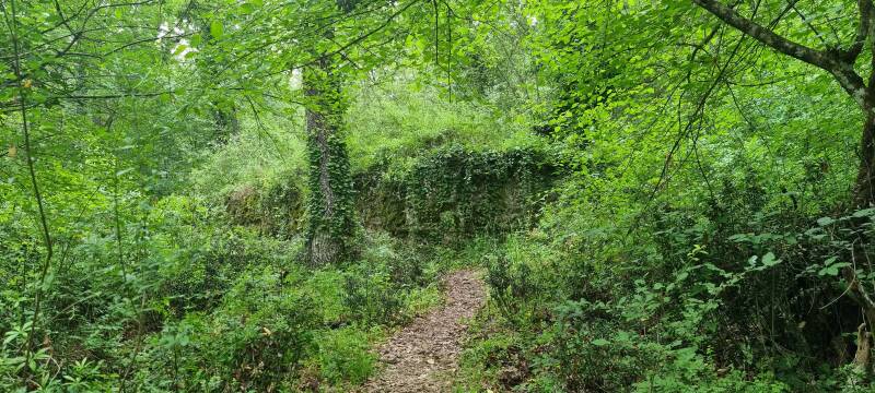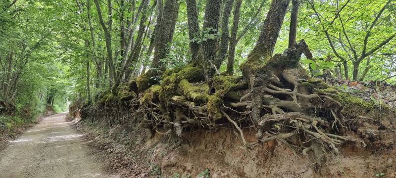 Een stevige klim omhoog langs ‘groot – groter – grootst’ huizen in een omgeving die gaat van groen naar groener naar groenst. Aan het eind van de weg, waar de Chiesa di Santa Maria de Roncone in de graskant staat te vervallen, duiken we onder het koele bladerdak van kastanje- en eikenbomen. Langs de kant van het pad worden we aangenaam verrast door de zachte lentekleuren van bijenblad en wilde cosmea. Het is heerlijk lopen maar wel opletten voor losse stenen en boomwortels. Een schuiver is zo gemaakt.
