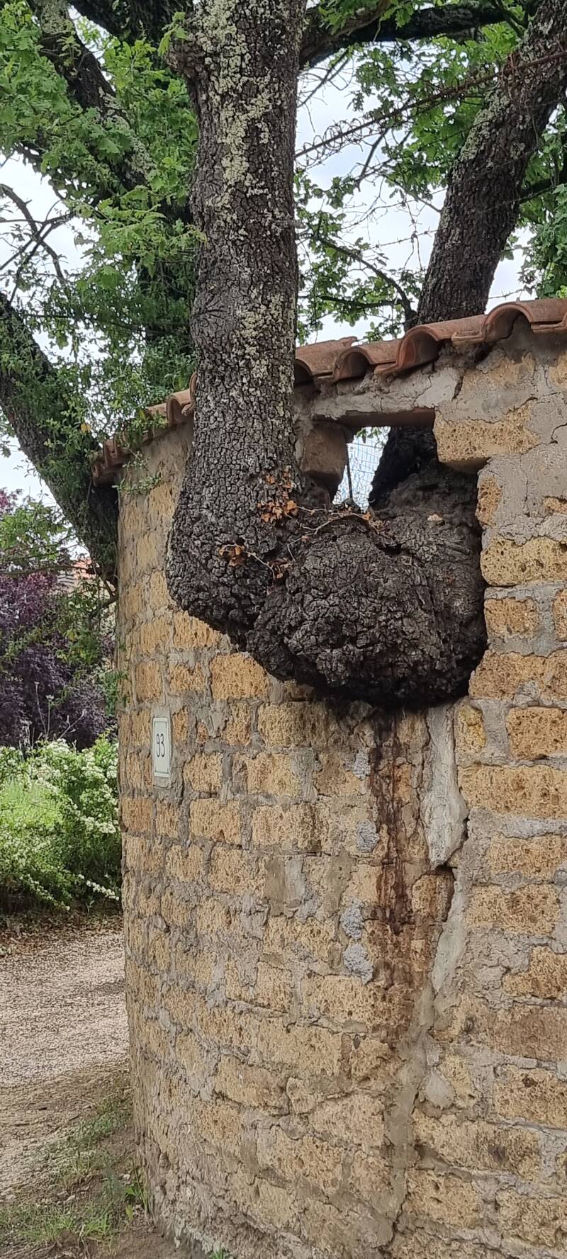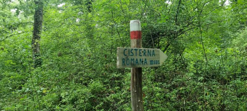 Daarna loopt de tocht verder omhoog, het geheimzinnige en blijkbaar gevaarlijke bos in waar dus effectief wilde zwijnen zitten gezien de sporen van omgewoelde aarde, mest en kogelhulzen. Een rustpuntje op het grondgebied van Vetralla, even bijkomen en genieten van het betoverende helgroene licht dat met de boomblaadjes speelt. Ook dat is een wandeltocht: stilstaan en kijken en herinneringen meenemen … aan de Cisterna Romana, een Romeins waterreservoir uit de 3e eeuw dat het amper kan winnen van het mos en de klimplanten, aan de Sasso Grosso, het natuurmonument in de vorm van een gigantische zwerfkei waarbij we ons afvragen hoe die in ’s hemelsnaam diep in een immens bos terechtkomt [Gedropt uit een helikopter? Nee hoor, waarschijnlijk het resultaat van een vulkanische explosie in langvervlogen tijden.] en aan de boomstammetjes in een kring als kabouterzitjes.