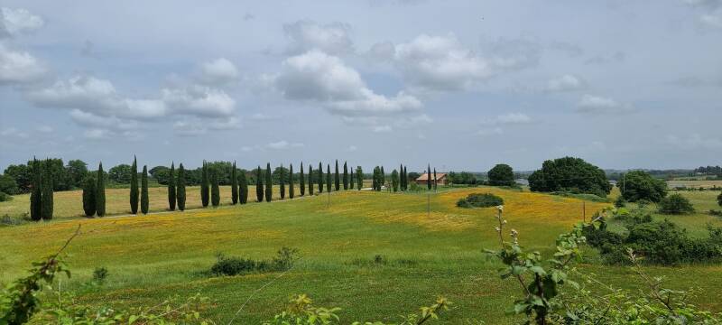 Een lange saaie asfaltbaan, die ook nog eens zeer onvriendelijk is voor wandelaars (want waar is de voetgangersstrook??), kunnen we eindelijk achter ons laten om links het platteland op te gaan. Ondanks de grijze bewolkte lucht is dit zalig lopen, tussen hazelnootboomgaarden (ja hoor nog steeds), parasoldennen en groene weiden. Langs een rustplaats met picknickbank voor de nodige knabbel/koek/fruit/drankje-pauze, langs een golfterrein en een stukje asfaltweg komen we terug op een zanderig pad, omringd door de bijzondere vergezichten van de Italiaanse boerenbuiten.