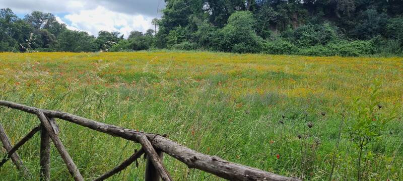 Een riviertje over, een veerooster over en we lopen zo de prachtige en weidse Valli del Sorbo in. Beschermd gebied waar je (met een beetje geluk) een hert kan spotten (volgens de bordjes) maar met meer zekerheid kleine zwarte salamandertjes. En opgelet: af en toe spot je ook een auto die op de zandbaan een stoffig spoor nalaat!